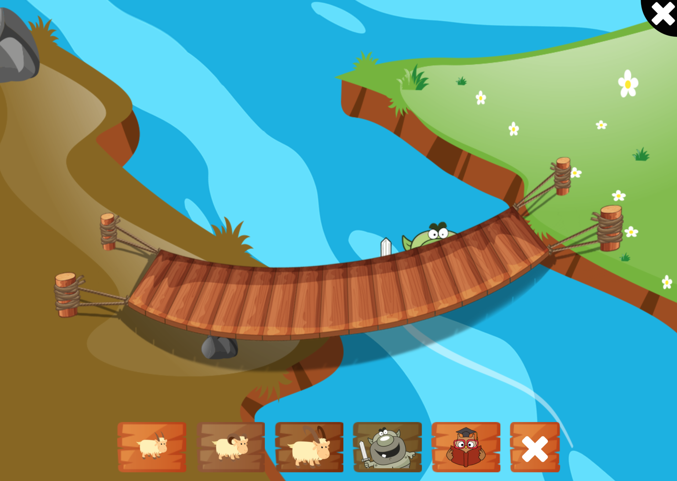 Vi har i denne version lavet eventyret om de tre bukkebruse som eksempel på, hvad Storyteller-appen kan bruges til. Her kan børnene krydse broen over til det grønne græs. Det er muligt at aktivere forskellige lydeffekter samt starte en oplæsning af eventyret.