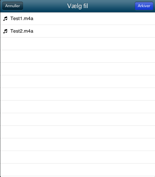 I lydfeltet trykker du på “Vælg fil” hvorefter en liste med lydfiler i app’en vises (se nedenfor). Når du har valgt den ønskede lydfil, trykker du på “Arkiver”.