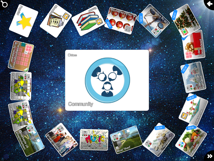 Fra gulvmenuen er det nu muligt at få direkte adgang til aktiviteter i community. Der er tilføjet en ny ”Community” sektion, hvor de senest delte aktiviteter i Community vises. Det er også muligt at se de mest populære aktiviteter samt søge baseret på niveau og emne.